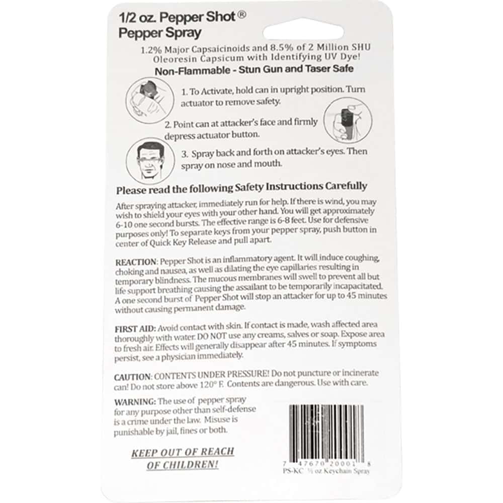 Pepper Shot model PS-KC by Safety Technology. Contains 1/2 oz of 1.2% major capsaicinoid formula rated at 2 million SHU. Stream spray pattern effective to 6-8 feet. Delivers 6-10 one-second bursts. Dimensions: 3 5/8″ x 1″. Weight: 0.12 lbs. Includes quick-release keyring, flip-top safety cap, and UV marking dye. Black finish. Pepper spray has a shelf life of approximately 3-4 years — replace expired units even if unused.