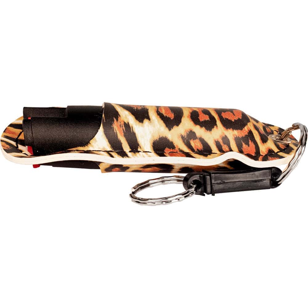 Canister dimensions: 4.75 x 1.63 inches with holster. Contains 0.5 oz of formula. Stream delivery pattern. Available in Black, Blue, Pink, Purple, Red, Leopard Black/White, Leopard Black/Pink, Leopard Black/Orange, Rhinestone Black, Rhinestone Pink, and Rhinestone Purple. Quick-release keychain included. Locking actuator safety.